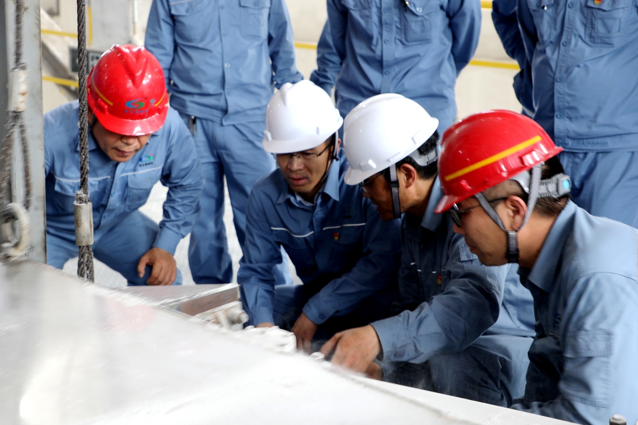 6月27日下午,公司黨委書記、董事長姜自成帶領公司分管領導以及設備、技術、安全等部門和車間、中心負責人,來到聯堿裝置現場調研。在設備旁、產線邊,與車間管理人員、操作員工面對面交流,仔細詢問工序流程、產能卡點,針對安全保障落實、設備運行效率、人員協作銜接、供銷保障節奏等問題,認真傾聽一線反饋。在瓶頸工序氯化銨區域,駐足觀察產品質量細節,與設備廠家探討優化方向。在產品包裝區域,查看包裝線改造進度和效果。在倉儲中心立體庫,檢查測試消防設施,要求針對夏季高溫多雨特征,切實落實安全防范措施。