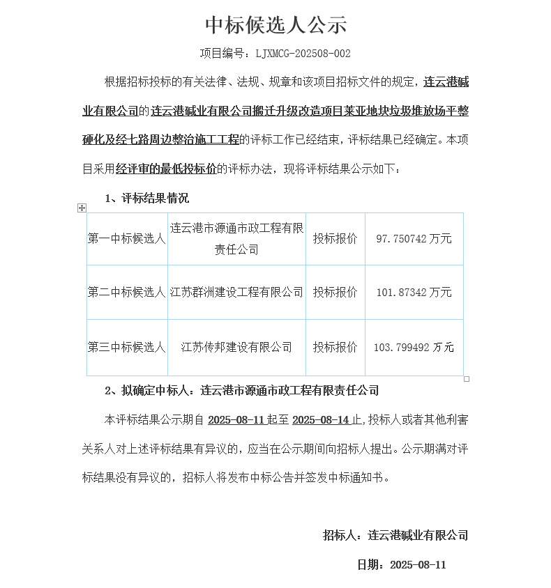 搬遷升級改造項目萊亞地塊垃圾堆放場平整硬化及經七路周邊整治施工工程中標候選人公示