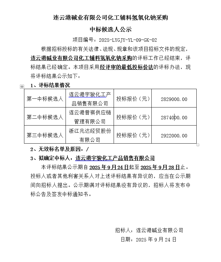 連云港堿業有限公司化工輔料氫氧化鈉采購中標候選人公示