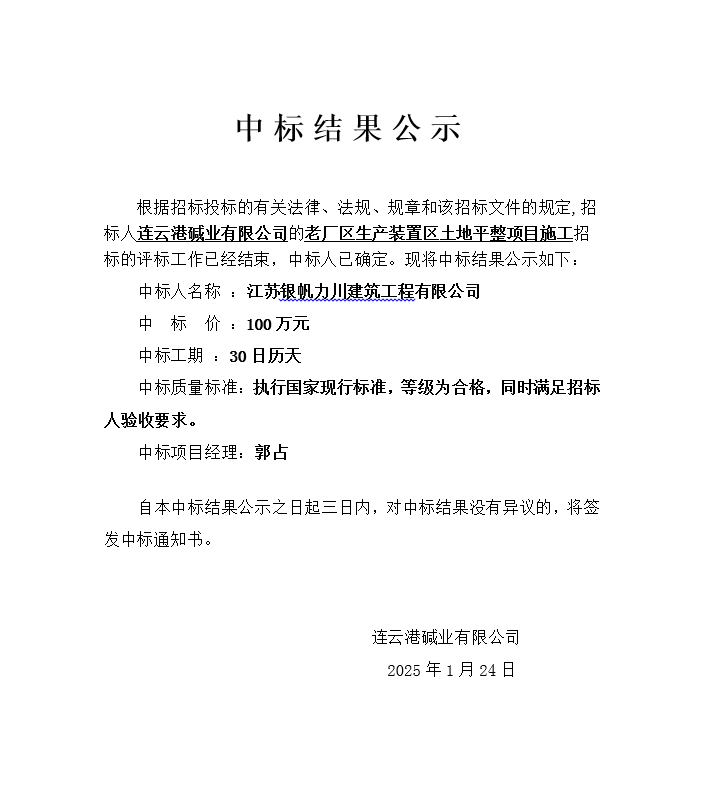 老廠區生產裝置區土地平整項目施工中標結果公示